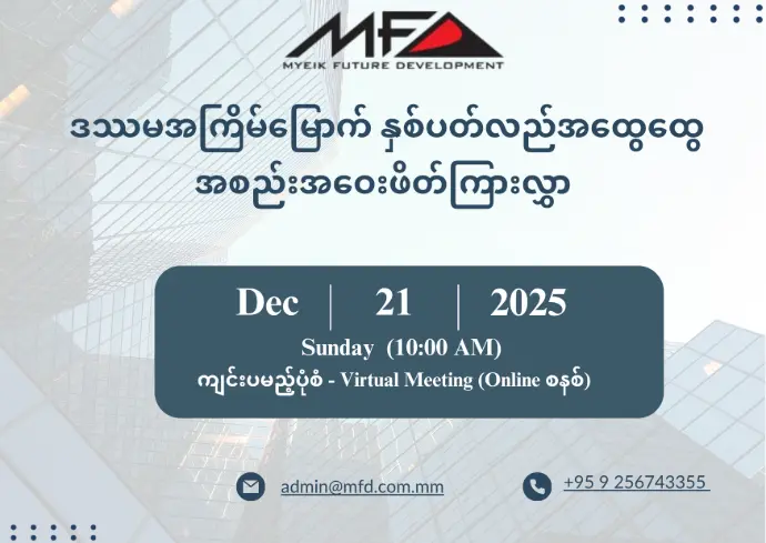 ဒဿမအကြိမ်မြောက် နှစ်ပတ်လည် အထွေထွေအစည်းအဝေးအား ၂၀၂၅ ခုနှစ်၊ ဒီဇင်ဘာလ (၂၁) ရက်နေ့တွင် ကျင်းပပြုလုပ်သွားမည်ဖြစ်ပါသည်။